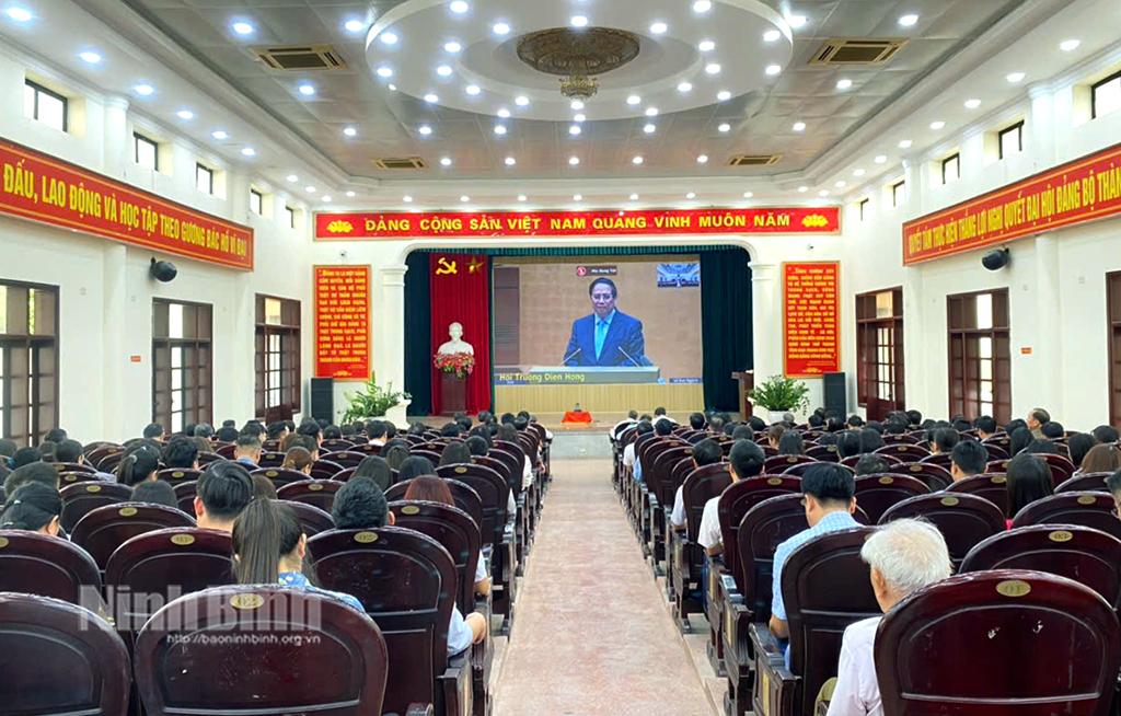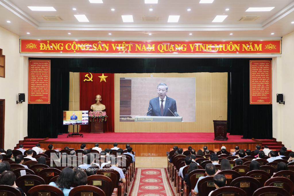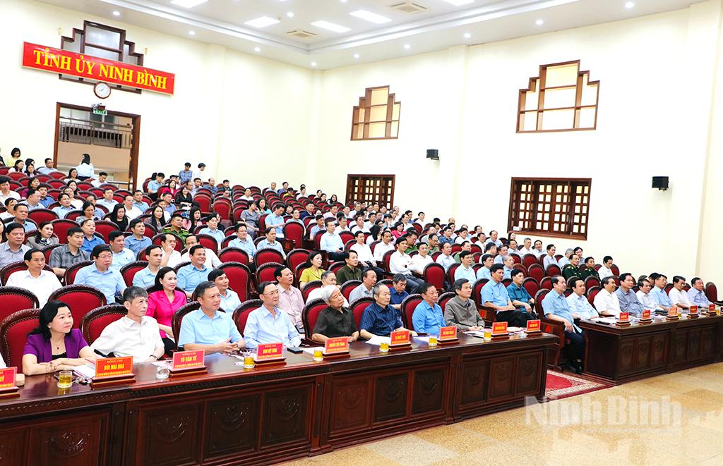 Dự hội nghị tại điểm cầu Tỉnh uỷ Ninh Bình có các đồng chí: Đoàn Minh Huấn, Uỷ viên Trung ương Đảng, Bí thư Tỉnh uỷ; Đinh Văn Hùng, nguyên Uỷ viên Trung ương Đảng, nguyên Bí thư Tỉnh uỷ, nguyên Trưởng đoàn ĐBQH tỉnh; Mai Văn Tuất, Phó Bí thư Thường trực Tỉnh uỷ, Chủ tịch HĐND tỉnh; Phạm Quang Ngọc, Phó Bí thư Tỉnh uỷ, Chủ tịch UBND tỉnh.