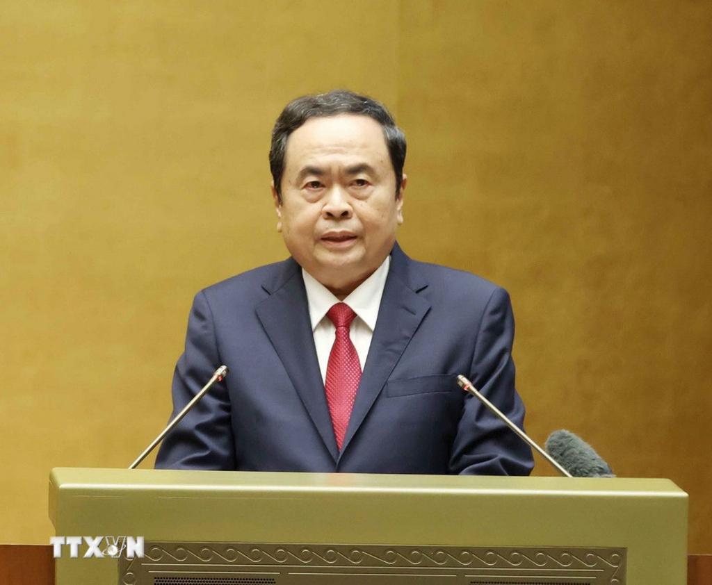 Chủ tịch Quốc hội Trần Thanh Mẫn truyền đạt chuyên đề “Về sửa đổi hiến pháp và pháp luật; Phương hướng bầu cử đại biểu Quốc hội khóa XVI và đại biểu Hội đồng nhân dân các cấp nhiệm kỳ 2026 - 2031”. Ảnh: TTXVN